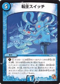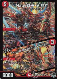 受け札兼打点増量枠です。<芸魔龍虎 ディメイジン>の出た時能力で<転生スイッチ>を使うことで、横にサイキッククリーチャーを置きながら「革命チェンジ」元が場に出てくるので<転生スイッチ>の枚数だけ打点が1体ずつ増えていきます。例えば相手に<飛翔龍 5000VT>を出されて盤面が空になったとします。パワー5000以下が出せないので<Napo獅子-Vi無粋|オレの歌 聞けよ聞かなきゃ 殴り合い>を召喚してから<芸魔龍虎 ディメイジン>に「革命チェンジ」。