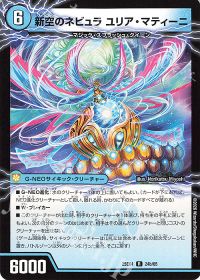 裏面の<新空のネビュラ ユリア・マティーニ>も実は強力な能力を持っています。出た時に相手のクリーチャーを1体戻すと、相手は次の自分のターンの初めまで手札に戻したクリーチャーと同じコストのクリーチャーを出せなくなるので、<終末の時計 ザ・クロック>のような「S・トリガー」をケアしたりできます。