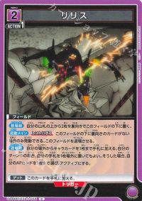 <1-058 リリス>は登場時にデッキトップ2枚を自身の下に裏向きで置きます。起動メインで自身の下に裏向きのカードがないとき発動でき、このカードを退場させます。退場時に場外からキャラカードを1枚回収できます。また、手札を1枚破棄することでAP1枚をアクティブに出来ます。