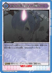 必要エナジーが0の〈ナツキ・スバル〉をアタッカーに変換できる優秀なカードです。自身がインパクトを持つため、相手のフィールドにBP4000のキャラしかいない場合は、<5/1レム>のインパクトと『BP4000以上のキャラにブロックされない。』を付与した〈ナツキ・スバル〉でアクティブトリガーを無効化しながら2点のライフを削ることができます。
