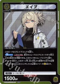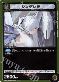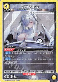 SPECIALトリガーを持つキャラカードで、登場時にも相手のキャラを退場させる効果を持ちます。〈シンデレラ〉名称以外のカードが効果で選ばれないようになるため、登場後の制圧力も非常に高く、フィニッシャーとして申し分ない性能です。必要エナジーは10と非常に重いものの、<0/1エイブ>によるエナジー軽減や<4/1グレイブ(レイド)>によるリムーブエリアからの踏み倒し等のギミックが搭載されているため、それ程気になりません。