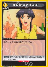 このデッキのエースカードです。2AP必要ですが、登場時にアクティブになり、相手のキャラをレストにするか、自分と相手のキャラを退場させるかを選択できます。自分のキャラを退場させた場合でも、次に使用するキャラの消費APが軽減されるので、実質自分のキャラは減っていません。退場時効果を持つ<0/1 綾波レイ>や<4/1綾波レイ>と組み合わせると、さらに強力です。<3/1葛城 ミサト>の効果で登場させた場合は、自身のアクティブ化と登場時のレスト効果で、最大2体分のアタックを止めることができるのも非常に優秀です。